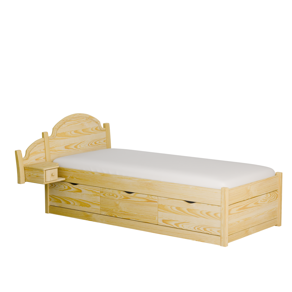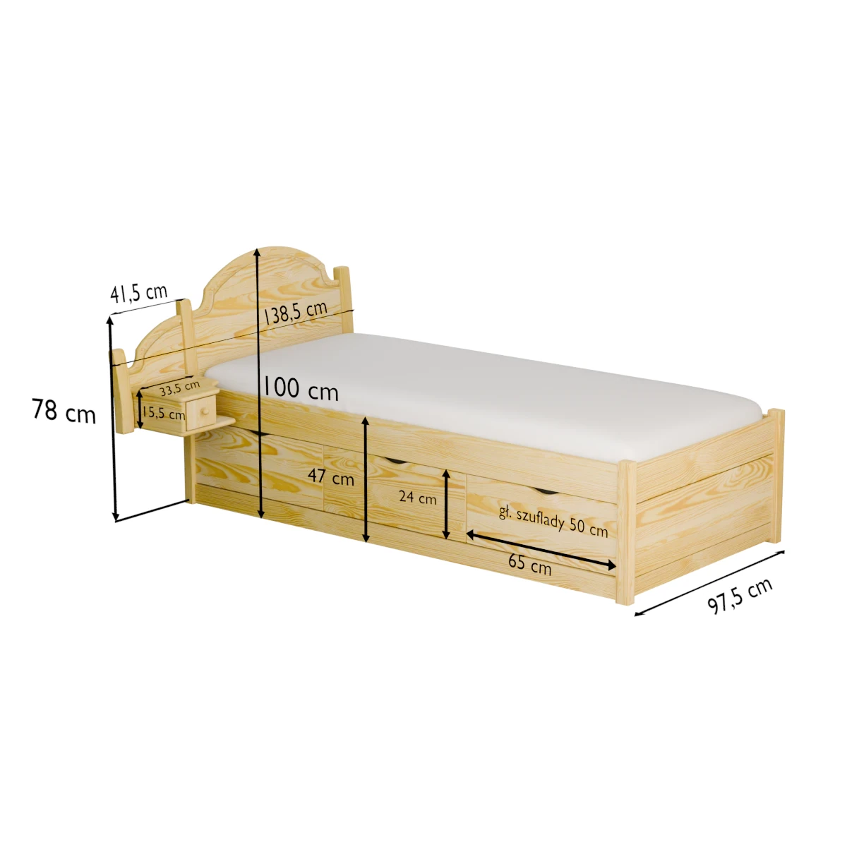 - W skład łóżka wchodzą trzy szuflady, stolik nocny oraz stelaż pod materac