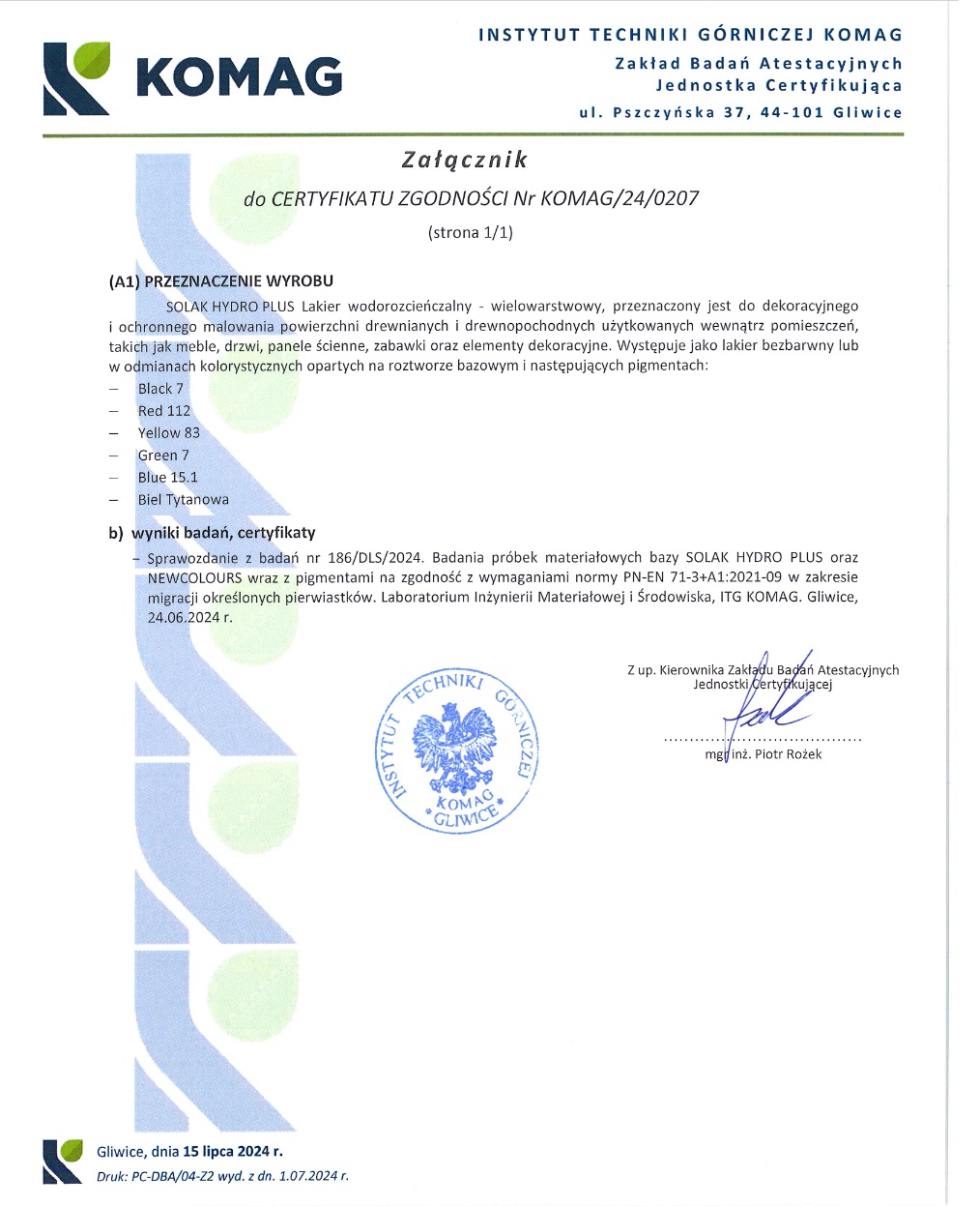 Certyfikaty i ostrzeżenie bezpieczeństwa: Certyfikat KOMAG/24/0207. Potwierdzenie zgodności z normą PN-EN 71-3+A1:2021-09.