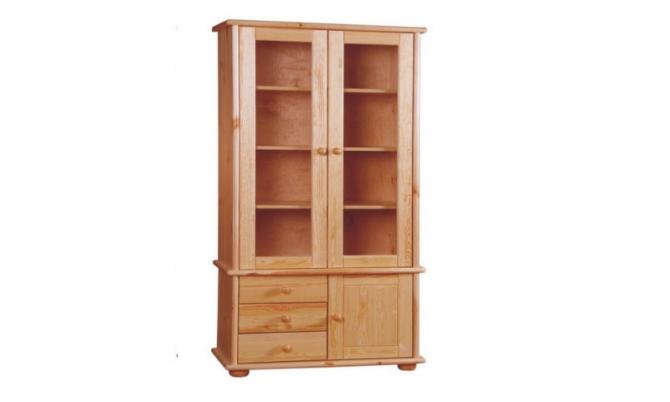 Wykonana z drewna sosnowego, tylna ściana i dna z płyty w kolorze drewna, na dole 3 szufladki + drzwiczki, wewnątrz półka